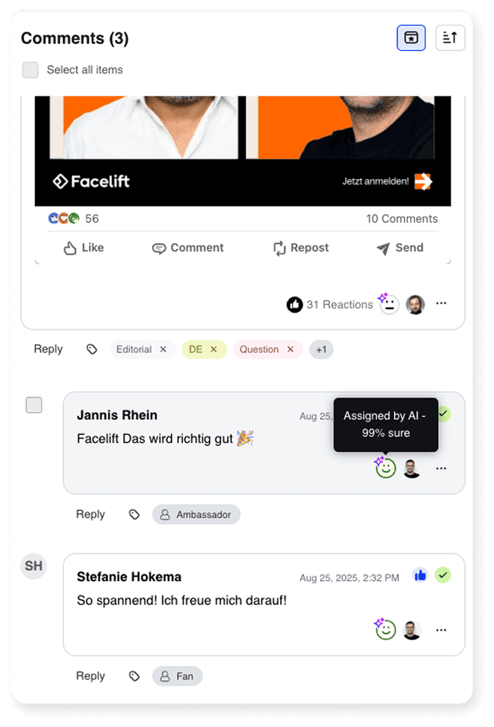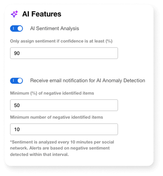 Understand your audience’s mood at a glance and get notified when negative sentiment spikes. Reliable AI insights help you react faster and stay ahead of potential crises.